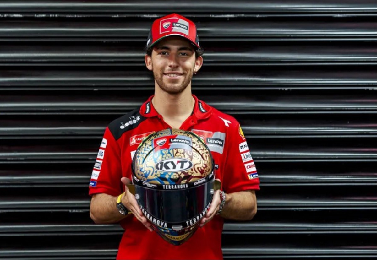 Helm spesial tersebut akan digunakan Bastianini saat berlaga di Sirkuit Mandalika, Minggu (5/10), dan langsung mencuri perhatian para penggemar balap Tanah Air.