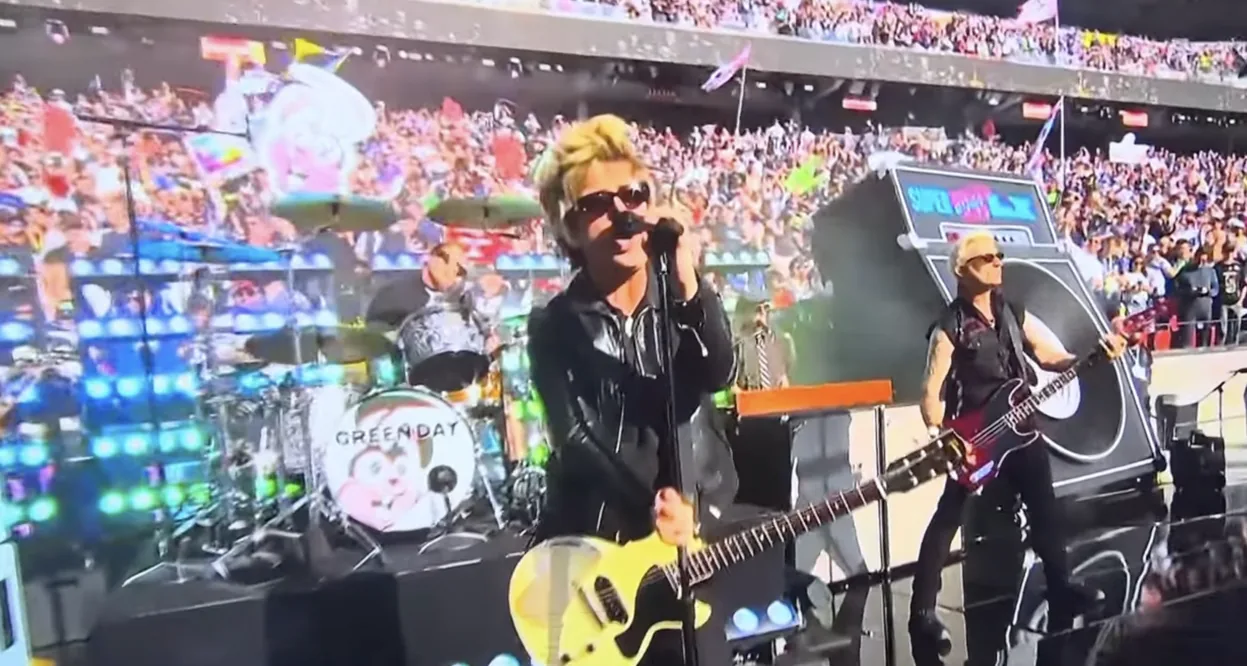 Monitorday.com – Band rock legendaris Green Day tampil memukau dalam acara pembukaan Super Bowl LX di Levi’s Stadium, California, Minggu (8/2). Dalam penampilan singkat berdurasi enam menit, grup asal Bay Area tersebut membawakan medley lagu-lagu populer mereka tanpa menyampaikan pernyataan politik, sesuatu yang kerap melekat pada penampilan Green Day selama ini.