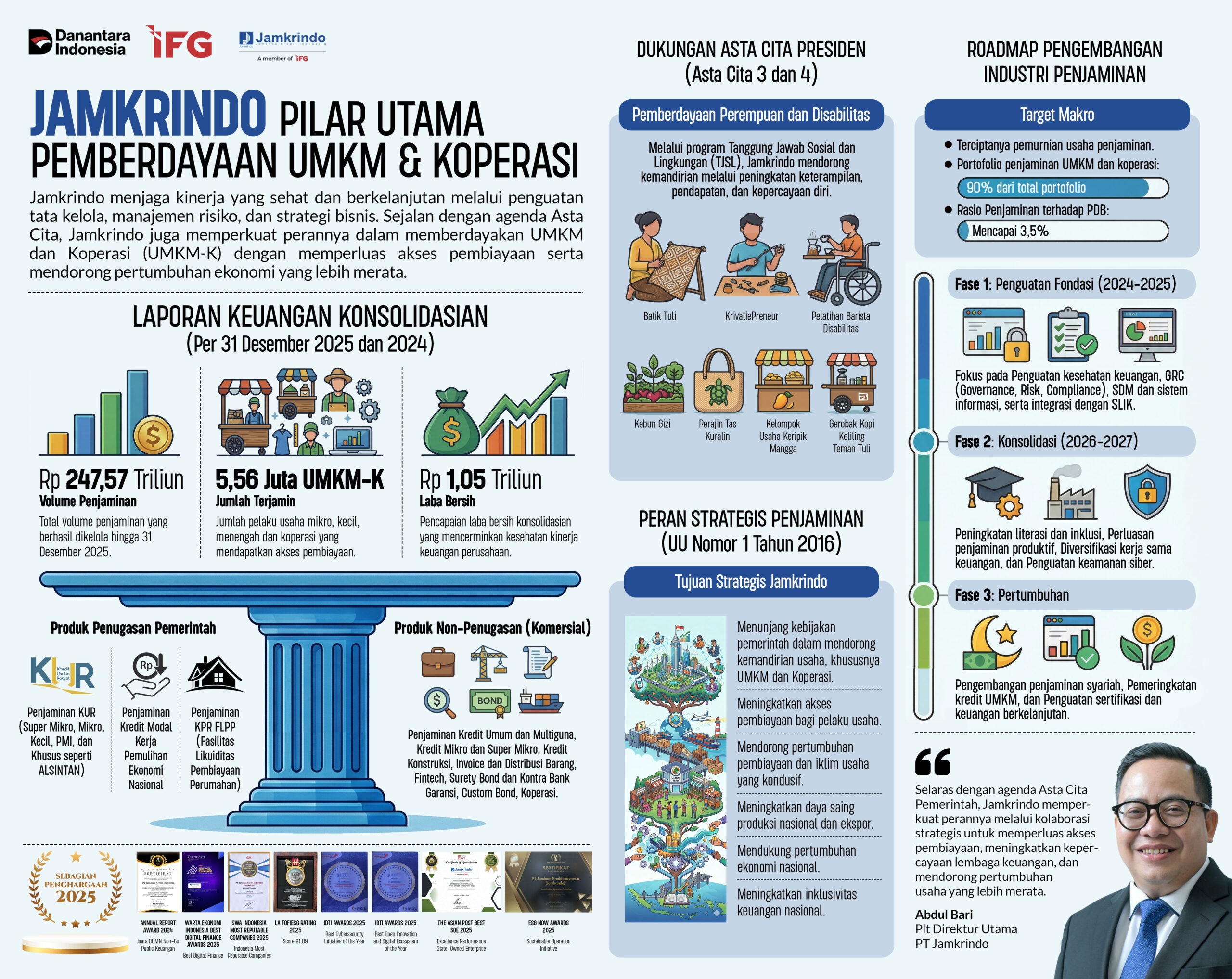 Di saat sektor usaha mikro, kecil, menengah, dan koperasi (UMKM-K) menjadi tulang punggung ekonomi nasional, kebutuhan akan akses pembiayaan yang inklusif dan berkelanjutan menjadi semakin penting. Tidak semua pelaku usaha memiliki jaminan yang cukup untuk memperoleh kredit dari lembaga keuangan. Di sinilah peran lembaga penjamin seperti Jamkrindo menjadi sangat strategis—menjembatani kebutuhan pembiayaan dengan kepercayaan industri keuangan.