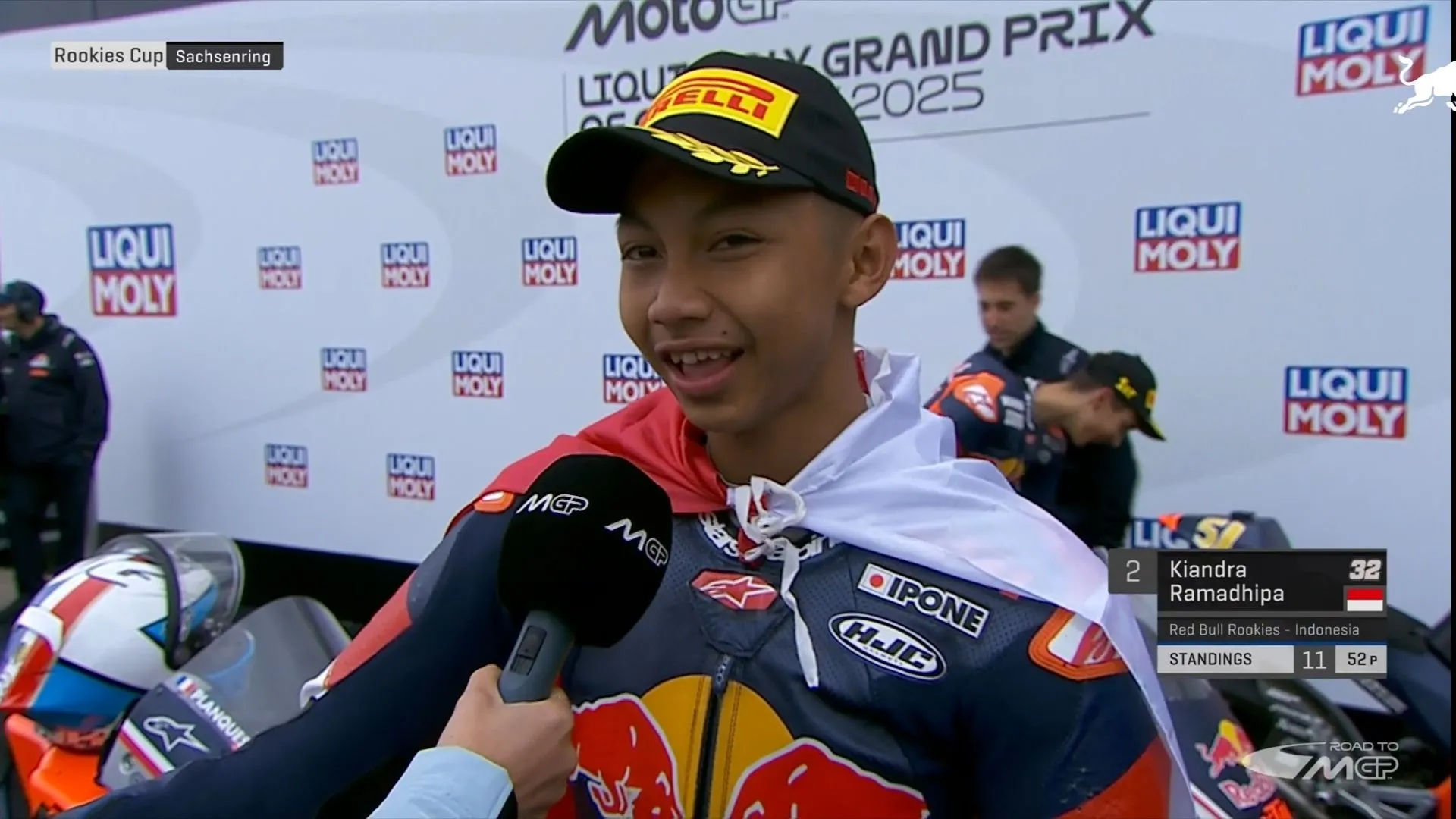 Monitorday.com — Pembalap muda Indonesia, Kiandra Ramadhipa, mencatatkan prestasi gemilang dengan finis di posisi kedua pada Race 1 Red Bull Rookies Cup 2025 seri Jerman di Sirkuit Sachsenring, Sabtu (12/7).