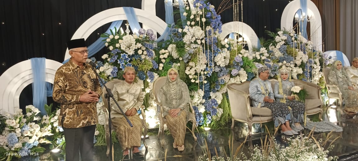 Sementara itu, Dr. Mukhlas Rowi yang juga Komisaris PT Jamkrindo menyampaikan rasa syukur dan terima kasih atas kehadiran Prof. Haedar Nashir serta para undangan yang telah meluangkan waktu untuk memberikan doa restu. Ia menilai pesan yang disampaikan Prof. Haedar menjadi nasihat berharga bagi kedua mempelai dalam menapaki kehidupan rumah tangga.